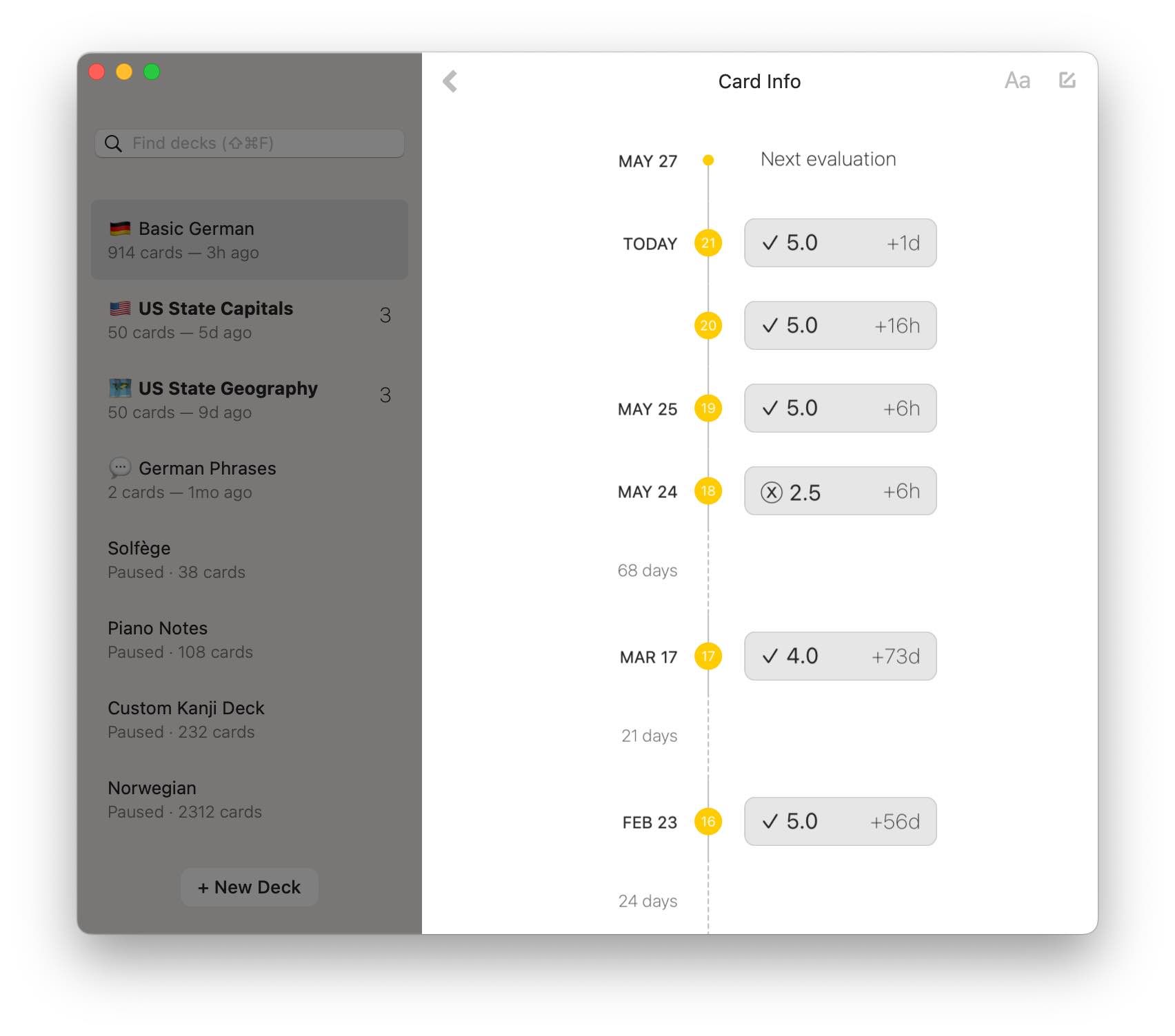 Using an efficient spaced repetition algorithm, Fresh Cards takes care of scheduling when cards are reviewed for you.