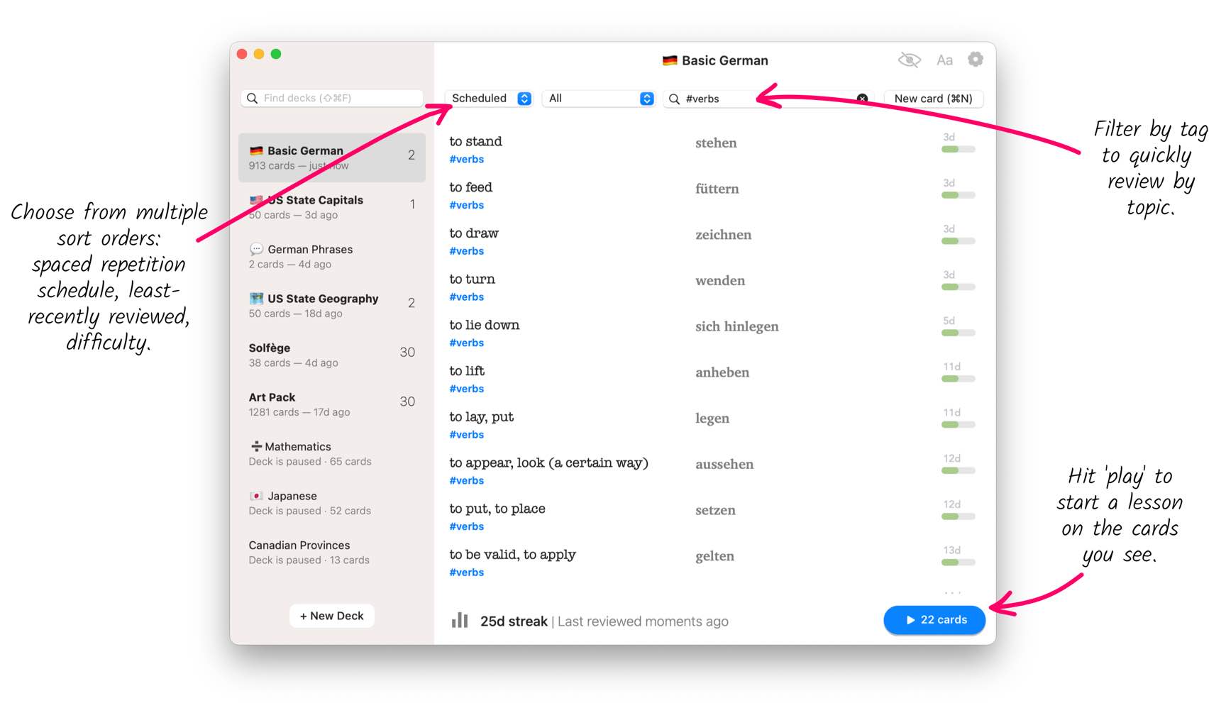 Using an innovative playlist UI, what you see is what you review. Just hit “play” to start a review. Want to focus on a subset of your cards? Filter by tag and hit “play”.