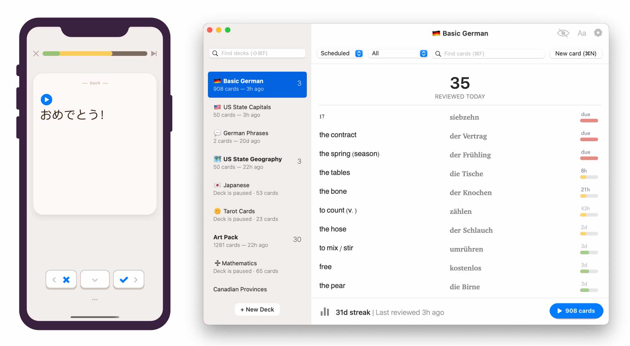 With a simple pay-once model, Fresh Cards allows you to sync your deck and reviews to iCloud. No subscriptions, no hidden fees.